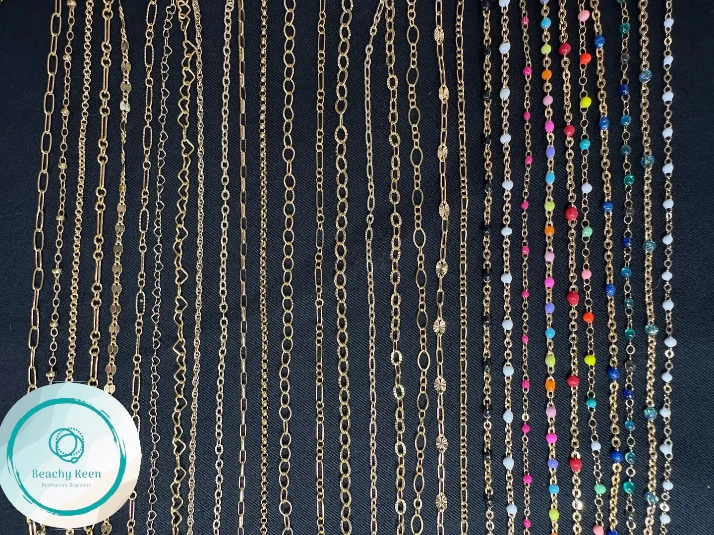 We offer over 90 different chains with more being added all the time! Choose from Sterling Silver, 14k Gold Filled, Solid 14k Gold, or Stainless Steele. Whether it’s your first piece of permanent jewelry or your tenth, we promise you’ll find the perfect chain!